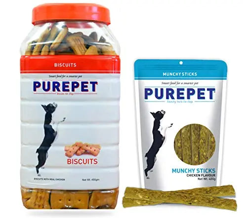 Purepet Treat Combo Offer - Chicken Flavor Biscuit Jar (2 x 455g) + Munchy Sticks, Chicken Flavor (2 x 400g) - Pack of 4