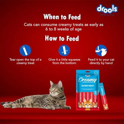 Drools Creamy Lickable Cat Treat Seafood Medely (Pack of 5 Pouches, 375g), All Life Stages